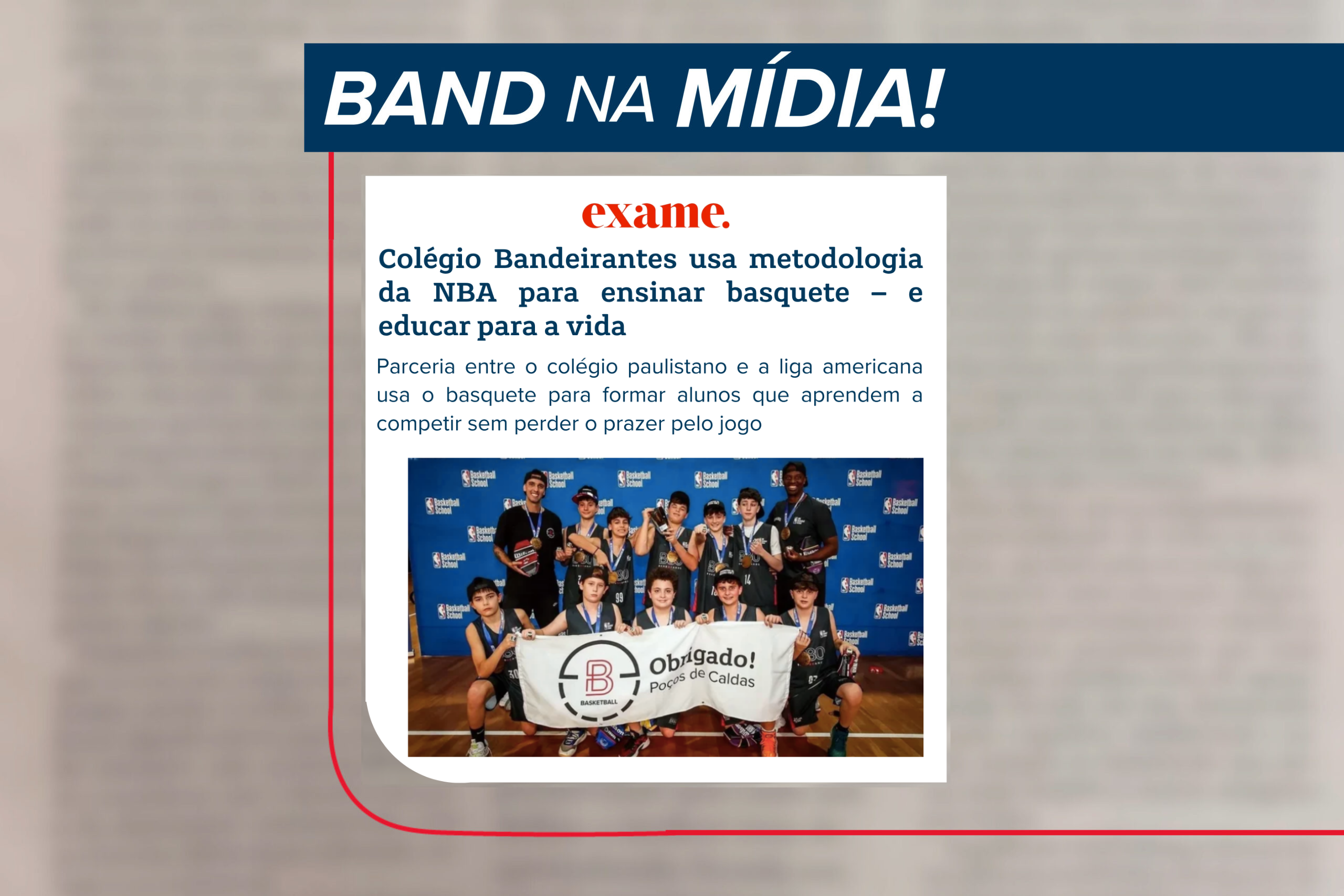 O Band foi manchete na Exame! Carlos Alberto De Simone, nosso Coordenador de Educação Física, e Rafael Aguirre, aluno do 7.o ano do Band, fizeram parte de uma matéria que exaltou a parceria da NBA Basketball School com o Colégio, firmada em 2023.