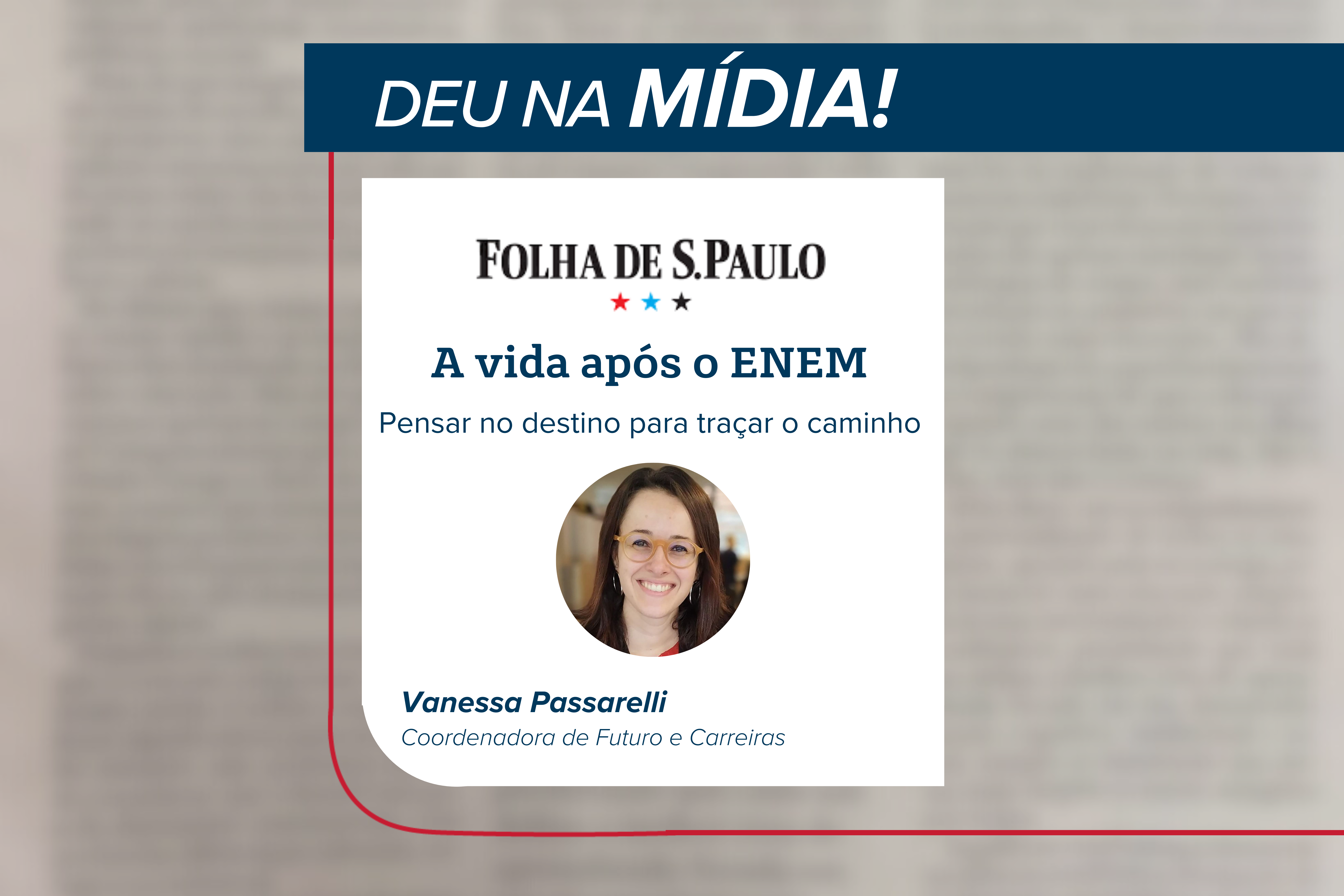 Vanessa Passarelli, Coordenadora de Futuro e Carreiras do Band, participou da newsletter especial da Folha de S.Paulo sobre o ENEM! No texto, o jornalista apresentou critérios para a construção dos próximos passos após a realização do Exame Nacional do Ensino Médio e orientou sobre as possibilidades de acesso universitário com a utilização do resultado.