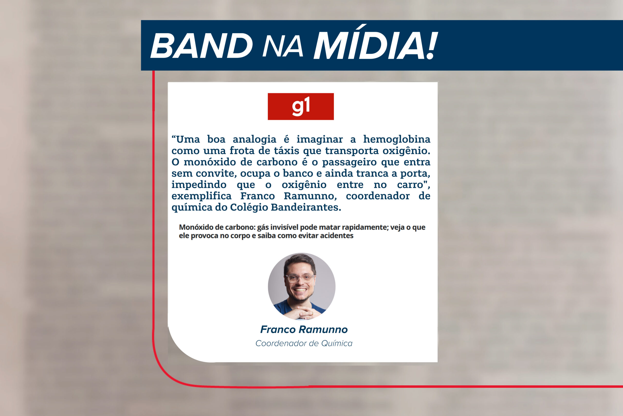 Confira o trecho da matéria: “‘Uma boa analogia é imaginar a hemoglobina como uma frota de táxis que transporta oxigênio. O monóxido de carbono é o passageiro que entra sem convite, ocupa o banco e ainda tranca a porta, impedindo que o oxigênio entre no carro’, exemplifica Franco Ramunno, coordenador de química do Colégio Bandeirantes”.