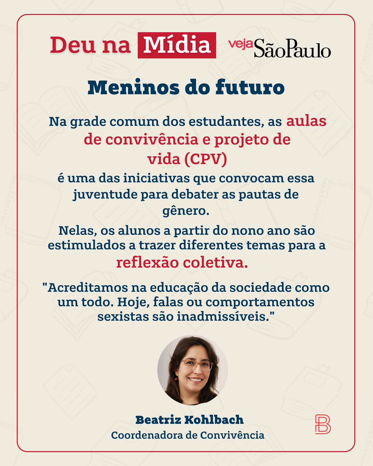 A Coordenadora de Convivência do Colégio, Beatriz Kohlbach, participou de uma reportagem sobre educação e masculinidade na Revista Veja. A matéria aborda como instituições e especialistas têm se posicionado para enfrentar a violência de gênero no país desde a juventude.