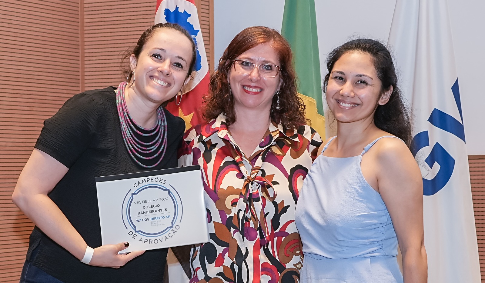 A coordenadora de Futuro e Carreiras, Vanessa Passarelli (à esquerda), e Juliana Puglia Higa de Lima, Orientadora de Futuro e Carreiras (à direita), recebem o certificado de “Campeões de Aprovação” da professora da FGV, Marina Feferbaum (ao centro).